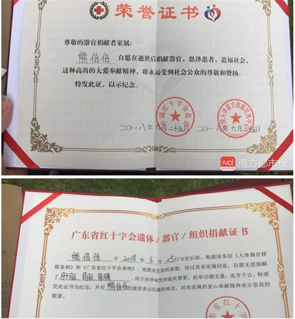 最终,熊作群在医护人员的手上分两次拿到了熊倍倍的病历、拍的片子,以及两本红皮烫金字的荣誉证书。两本荣誉证书,一本是广东省红十字会器官捐献证书,一本是中国红十字会总会和中国人体器官捐献管理中心落款的荣誉证书。